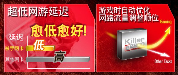 华擎 Killer 系列配备 Killer™ E2200 智能网络平台,专为在线游戏以及高品质串流媒体最大化网络性能。Killer E2200 支持 Advanced Stream Detect™ 技术,可以自动检测并加速游戏网络流量,保证更流畅的游戏性能。通过这项独创的自动流量优化功能,游戏以及实时聊天可获得较高网络优先权,通过控制网络硬件获得最低延迟的游戏数据。 |