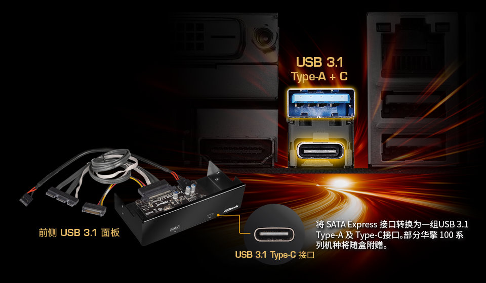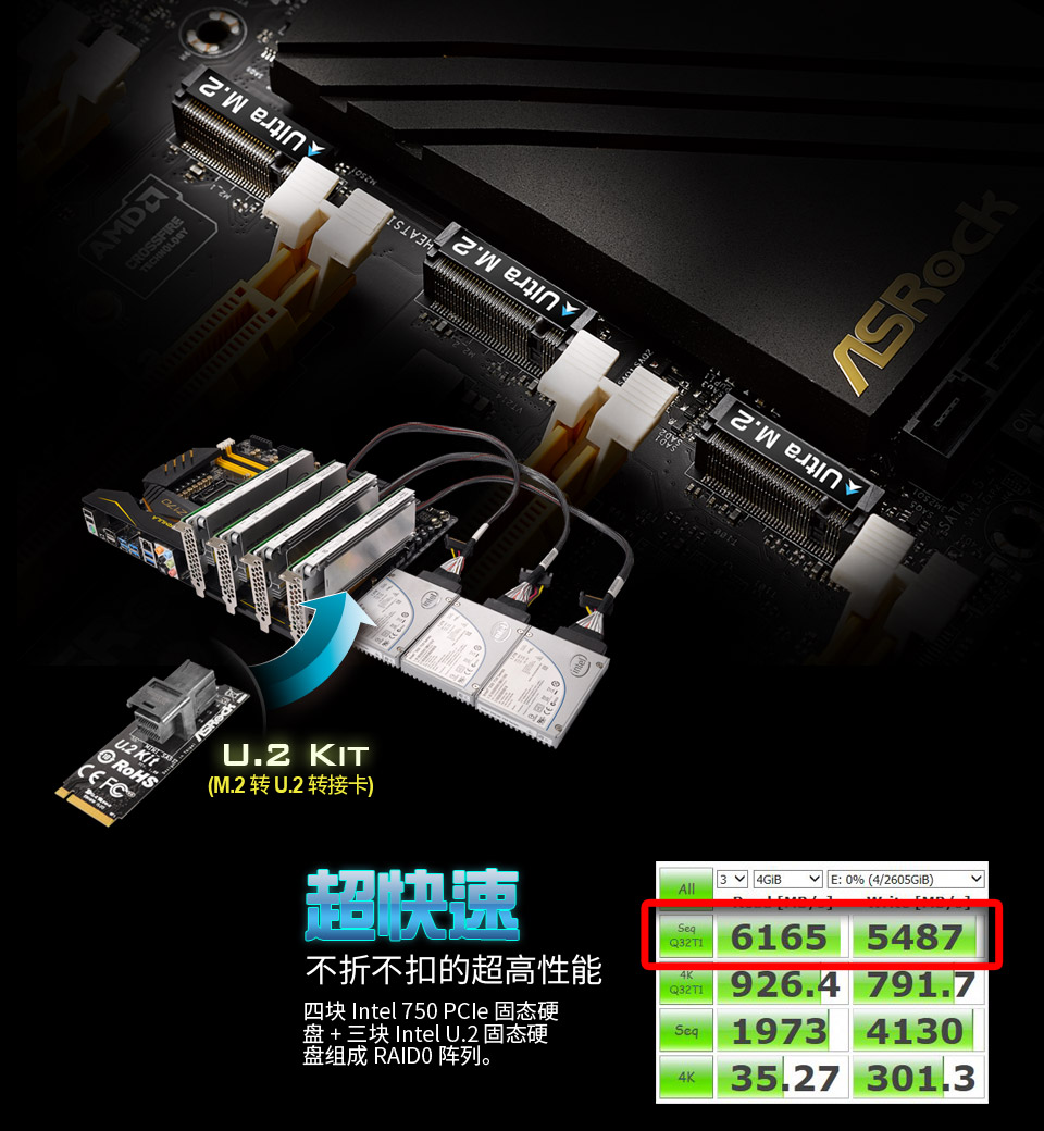 PCIe Gen3 x4 Ultra M.2 接口将数据传输速率提升至 32Gb/s。此外,该接口支持 SATA3 6Gb/s M.2 模块并兼容华擎 U.2 Kit,可连接某些全球最快速的 U.2 PCIe Gen3 x4 固态硬盘。