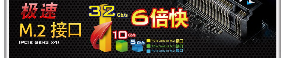 板载超級M.2 接口是为下一代固态硬盘等设备准备的全新接口界面,华擎是全球第一家将 PCIe Gen3 x4 M.2 接口应用在主板上的品牌,这样的超级 M.2接口将速度提升至 32Gb/s,比普通 M.2 Gen2 x1 接口的 5Gb/s 快6倍。除了支持PCIe Gen3 x4 M.2 模块, 超级M.2 更可同时支持 SATA3 6Gb/s 接口的M.2装置。