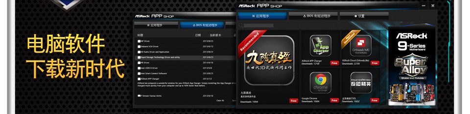 华擎应用市场是您最方便的 BIOS 及软件升级程序, 不定时提供最新版本 BIOS 及各种支持软件供用户下载, 更独家整合多款知名游戏, 让玩家轻松连结游戏世界。华擎这款业界首创新软件「应用市场」, 不仅让玩家可以轻松地维护系统, 让系统随时保持在最新状态, 不必担心软硬件的兼容性问题之外, 还能实时串联最夯电玩, 更可以第一时间了解华擎最新技术, 随时获得最完善的支持服务!中国区最新加入合作的两款重量级游戏分别是来自盛大的《九阴真经》和来自世纪天成的《CSOL反恐精英》,目前这两款游戏已经上线华擎应用市场,与其他众多热门游戏提供的华擎专属礼品包一起等你!