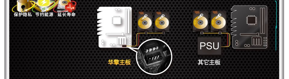 与传统电感相比,华擎的新一代高效电感可有效提高饱和电流达 3 倍,提高并改善主板的 Vcore 电压供应。