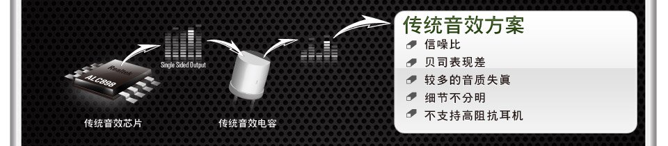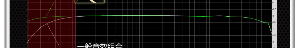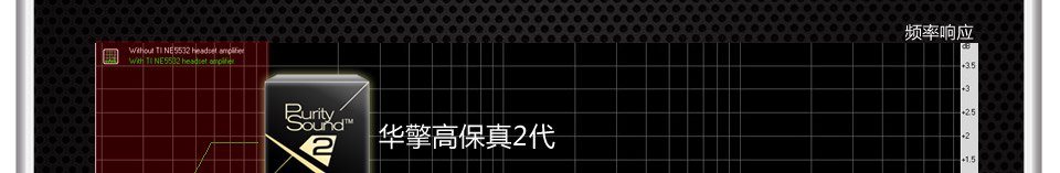此频率响应图表是在 32 欧阻抗下模拟普通耳机测试而得。实验显示显示传统音频方案的频率响应在低频率时显着下降,而华擎高保真2代技术则能保持其频率响应水平,与传统方案(1.6dB)相比提供高达20%的效能改善,更能通过 TI® NE5532 扩大器提供较好的低音音效。