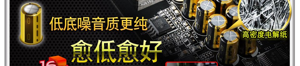 高保真2代技术包括基于瑞昱 ALC1150 音频编译码器的 7.1 声道高保真音频、带差分放大器的 115dB 信噪比数模转换器、无电容直接驱动技术、EMI 屏蔽盖、PCB 隔离屏蔽和 DTS Connect。而 Nichicon Fine Gold Series 专业音效电容可以显著降低噪声水平,甚至可以满足最挑剔音频发烧友的使用需求。