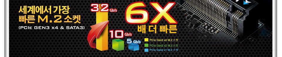 내장된 M.2 소켓은 차세대 폼팩터 (NGFF) SSD 또는 다른 장치들을 연결하기 위한 새로운 규격입니다. ASRock 은 세계에서 최초로 마더보드상에서 PCIe Gen3 x4 M.2 소켓을 시행했습니다. 궁극의 Ultra M.2 규격은 5Gb/s 로 제한된 다른 M.2 Gen2 x1 솔루션들과 비교해서 6배 더 빠른 최대 32Gb/s 의 속도를 밀어낼 수 있습니다. 게다가 PCIe Gen3 x4 M.2 모듈을 지원하고, Ultra M.2 는 SATA3 6Gb/s M.2 모듈 또한 지원합니다.