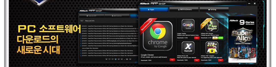 우리는 사용자들이 다운로드 할 수 있도록 다양한 응용프로그램과 소프트웨어 지원을 제공합니다. ASRock APP Shop 으로 여러분들은 쉽게 시스템을 최적화 하고 최신으로 마더보드를 유지할 수 있습니다.