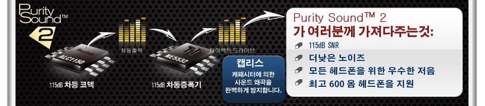 Purity Sound™ 2 는 리얼텍 ALC1150 오디오 코덱의 7.1채널 HD 오디오, 115dB SNR DAC 의 차동증폭기, 캡 리스 다이렉트 드라이브 기술, EMI 차폐커버, PCB 분리차폐 그리고 DTS 연결등을 포함합니다. 니치콘 오디오 캐패시터는 PC 에서 모든 오디오 애호가들이 갈망해온것으로, ASRock 은 Purity Sound™ 2 를 위해 이러한 고품질 캐패시터를 적용했습니다.