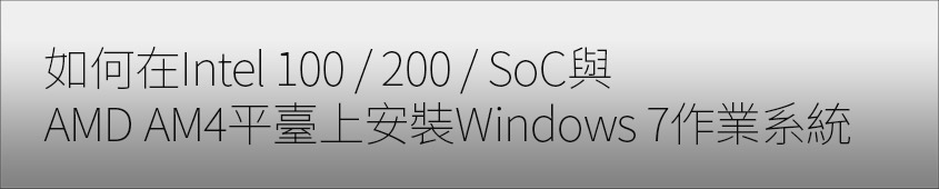 從Intel® N3000 系列 SoC 與 100 / 200 系列以及AMD AM4開始,已經不再支援 Enhanced Host Controller Interface(增強主機控制介面)。由於 USB 介面無法運行,因此您無法順利安裝 Windows 7 作業系統。