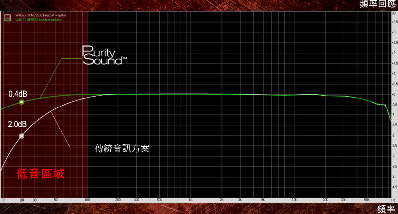 此頻率回應圖表是以32 歐阻普通耳機測試而得。實驗顯示傳統音效方案的頻率回應在低頻率時明顯地下降,而華擎 Purity Sound™ 天籟美聲技術則能夠保持其低頻頻率回應水平。在20 Hz低頻部分,Purity Sound 天籟美聲(0.4dB)與傳統方案(2.0dB) 相比, 提供高達20% (1.6dB)的效能改善! 除此之外, 透過 TI