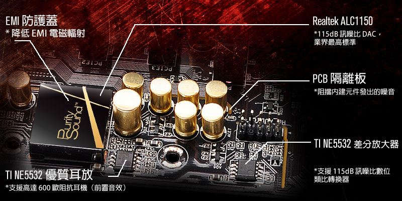 Purity Sound™ 115dB 天籟美聲技術結合多項硬體、軟體音訊解決方案與技術,即便是最為挑剔的音響迷,也能滿足他們的耳朵。包括 7.1 聲道高傳真音效及 Realtek ALC1150 音源編碼解碼器、115dB SNR DAC 及差分放大器、TI