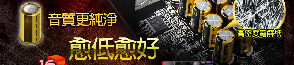 | 天籟美聲再進化!華擎科技大手筆採用 Nichicon Fine Gold 系列音效專用電容,保證滿足最挑剔的音響發燒友,提供您更純淨自然的超優質音效饗宴。 |
