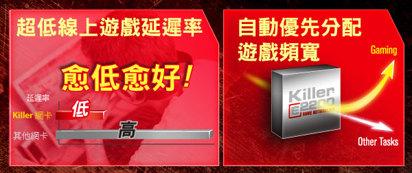 | 識別與加速遊戲流量,Killer LAN 以全新的線上遊戲效能,提供高速連網功能。 |