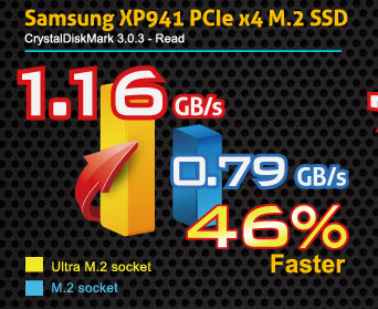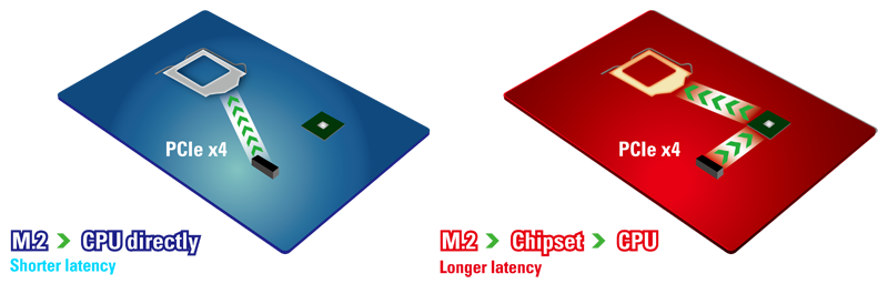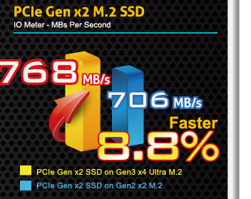 Compared to other M.2 design, Ultra M.2 design uses PCIe Gen3 x4 bandwidth from CPU directly which delivers lower latency and higher speed.