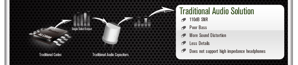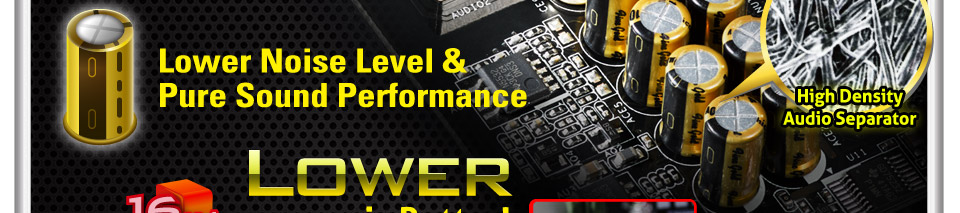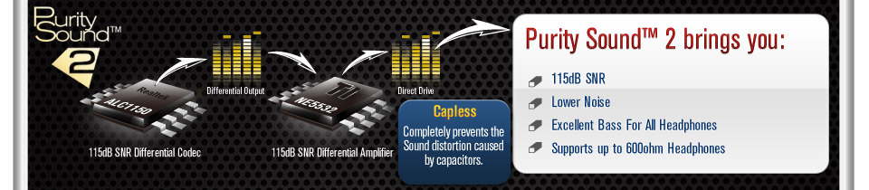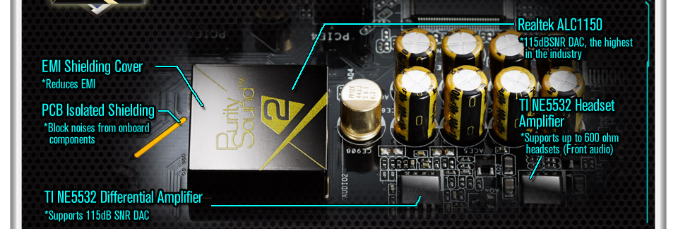 Purity Sound™ 2 includes 7.1 CH HD audio with Realtek ALC1150 audio codec, 115dB SNR DAC with Differential Amplifier, cap less Direct Drive technology, EMI shielding cover, PCB isolate shielding, and DTS Connect. As Nichicon audio capacitors are what every audiophile has been longing for on a PC, ASRock applied these high quality capacitors for Purity Sound™ 2.