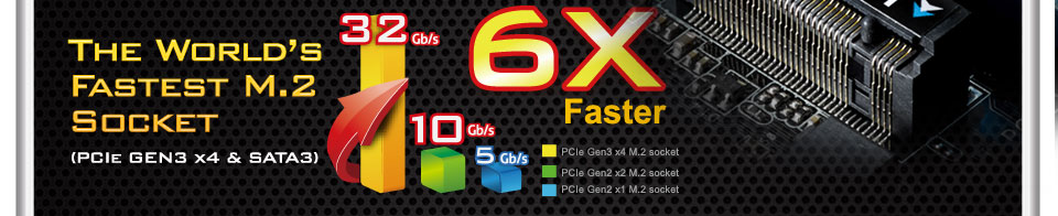 The onboard M.2 socket is a new interface for connecting Next Generation Form Factor (NGFF) SSDs or other devices. ASRock is the first in the world to implement PCIe Gen3 x4 M.2 socket on motherboards. The ultimate Ultra M.2 interface pushes the speed up to 32Gb/s which is 6X faster compared to other M.2 Gen2 x1 solutions that are limited to 5Gb/s. In addition to support PCIe Gen3 x4 M.2 modules, the Ultra M.2 also supports SATA3 6Gb/s M.2 modules.