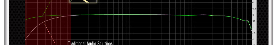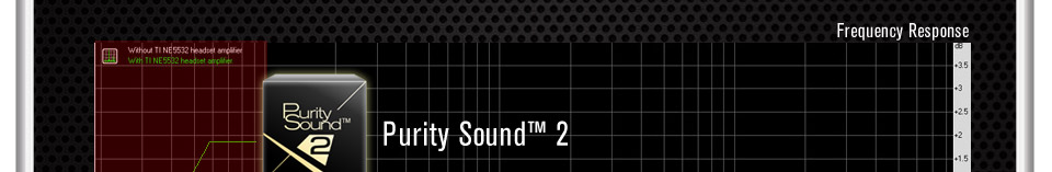 This frequency response chart was tested with 32 ohm normal headphones. It indicates how traditional audio solution's frequency response drops drastically at low frequencies. Compared to traditional audio solution's (2.0dB) at 20 Hz bass low freq area, Purity Sound™ still maintains its frequency response (0.4dB) and provides better bass with the TI® NE5532 amplifier, improving the bass quality by 20% (1.6dB)!