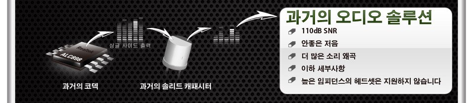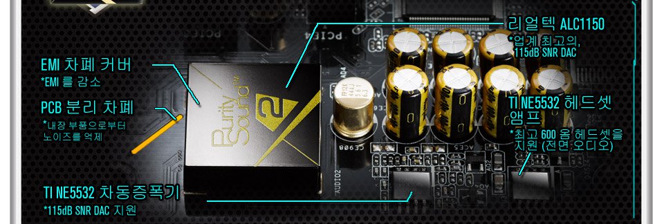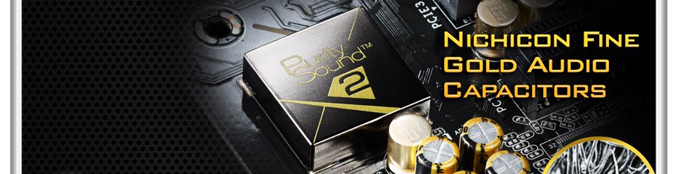 Purity Sound™ 2 는 리얼텍 ALC1150 오디오 코덱의 7.1채널 HD 오디오, 115dB SNR DAC 의 차동증폭기, 캡 리스 다이렉트 드라이브 기술, EMI 차폐커버, PCB 분리차폐 그리고 DTS 연결등을 포함합니다. 니치콘 오디오 캐패시터는 PC 에서 모든 오디오 애호가들이 갈망해온것으로, ASRock 은 Purity Sound™ 2 를 위해 이러한 고품질 캐패시터를 적용했습니다.