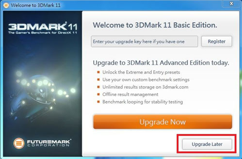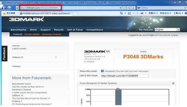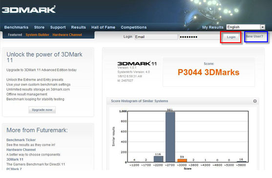 You can also register for an ID at http://3dmark.com/login first. With this ID, you can upload all 3DMark 11 scores you run, and the system will auto save your results. Furthermore, you can upload all kinds of 3DMark scores, share with your friends, and compare the results with others, even share on your Facebook!