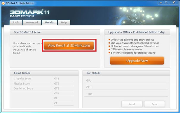 Once finishing the benchmark tests, please upload your score to 3DMark’s online data base: Select “View Result at 3DMark.com” |