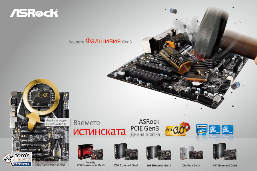 В дизайна на ASRock Z68 Extreme4 Gen3, PCI-E 3.0 пътеките (x8) са директно снабдявани от Ivi Bridge процесор към PCI-E Gen3 слот А, докато другите PCI-E 3.0 пътеки (x8) са свързани с PCI-E Gen3 Quick Switch IC (бърз превключвател). Чрез PCI-E Gen3 Quick Switch IC, дъното ASRock Z68 Extreme4 може да предложи PCI-E X16 широколентов канал за данни за PCI-E Gen3 слот А, когато една PCI-E 3.0 VGA карта е инсталирана или PCI-E 3.0 X8/X8 канал за данни за PCI-E Gen3 слот А и B, когато се ползват две видеокарти. |