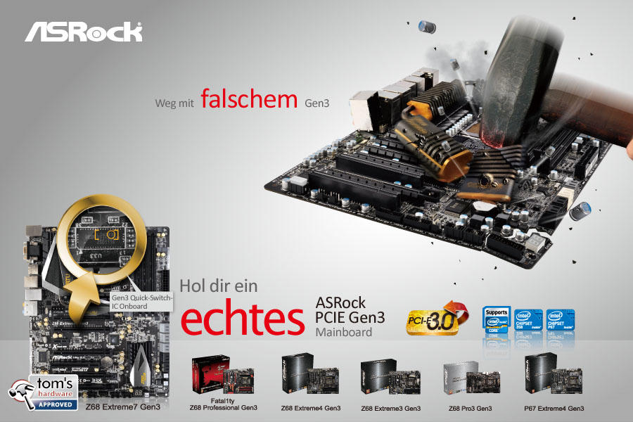 Derzeit erscheinen schnell und in großer Anzahl Mainboards, die den neuen PCI-E Gen3 Standard unterstützen. Bei dutzenden von PCI-E 3.0 Mainboards, die den Markt überschwemmen, kann das Auswählen eines neuen Mainboards so zu einer echten Herausforderung werden. Da ASRock bereits viele ECHTE PCI-E Gen3 Mainboards auf Basis des Intel Z68 oder P67 Chipsets vorgestellt hat, brauchen Sie sich bei der Auswahl des richtigen PCI-E 3.0 Mainboards nicht auf Ihr Glück verlassen.