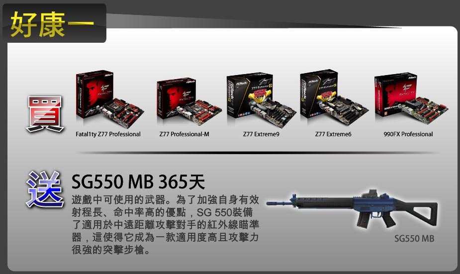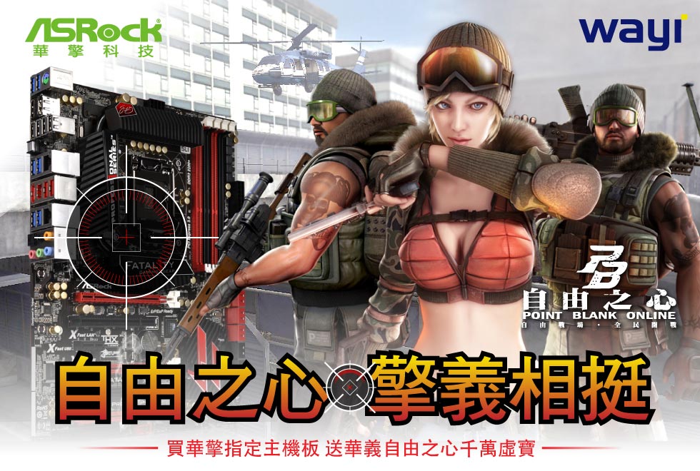 電競主機板領導品牌與遊戲大廠華義國際年度射擊類新作《自由之心Online》首度聯手出擊! 自由戰場,誰能引領你走向勝利之路? 答案就是專業電競主機板華擎ASRock! 由12次FPS 世界電玩冠軍Johnathan Fatal1ty與華擎科技合作,為專業玩家量身打造最適合電競比賽專用的Fatal1ty系列主機板,讓你在自由之心戰場所向無敵,制霸天下!