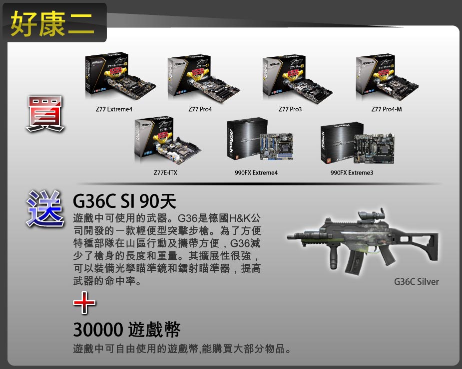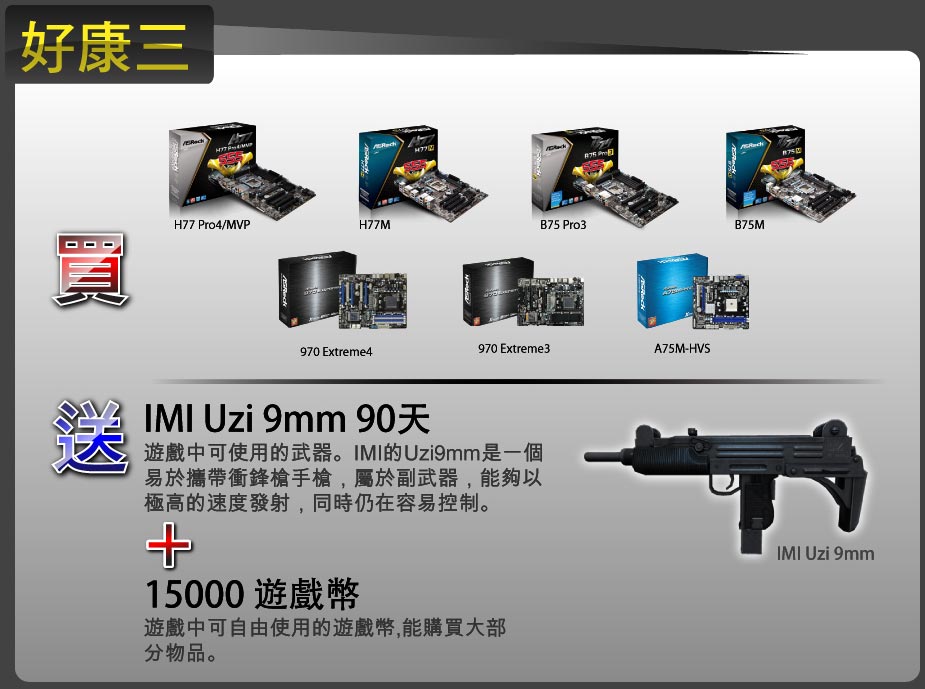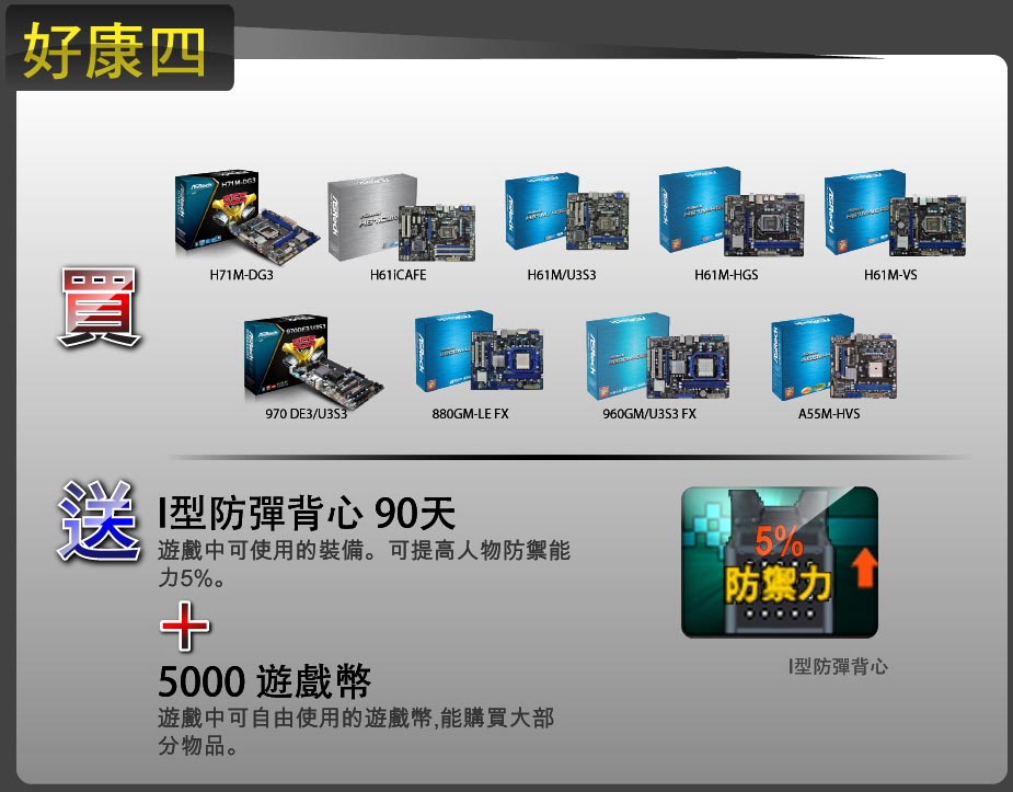 6月25日起至8月20日凡購買華擎指定型號主機板,內附自由之心虛寶刮刮卡,憑刮刮卡序號上網登錄即可免費獲得總價超過千萬的自由之心Online虛擬寶物及遊戲幣等,數量有限,送完為止