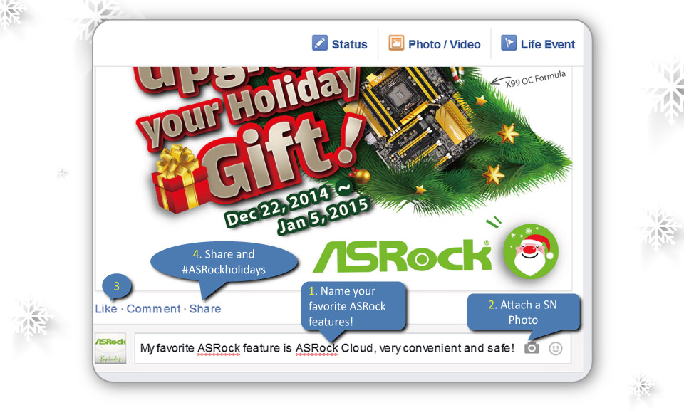 Winner will be notified individually via Facebook private messages within 3 days after the competition ends. The winner also can e-mail to marketing@asrock.com.tw if you didn't hear from ASRock. |