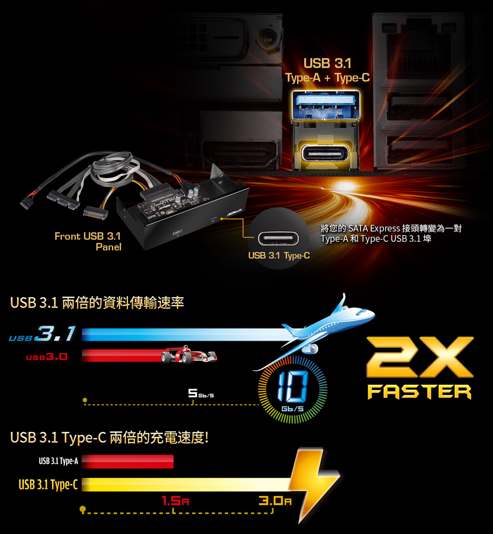 新世代的一對 USB 3.1 Type-A 以及 Type-C 介面提供高達 10Gbps 資料傳輸率。讓您能夠更方便的使用USB設備。