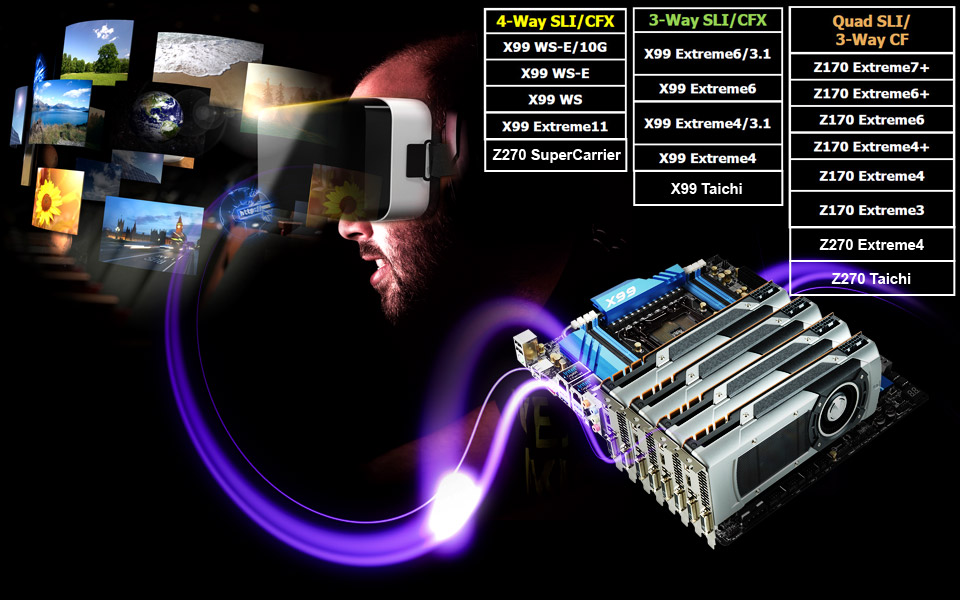 單張顯卡可能無法滿足創作複雜的虛擬實境(VR)內容的需求,因此華擎 Extreme 系列產品配備多個 PCIe 3.0 通道,可支援4-Way & 3-Way SLI / CrossFireX 技術。