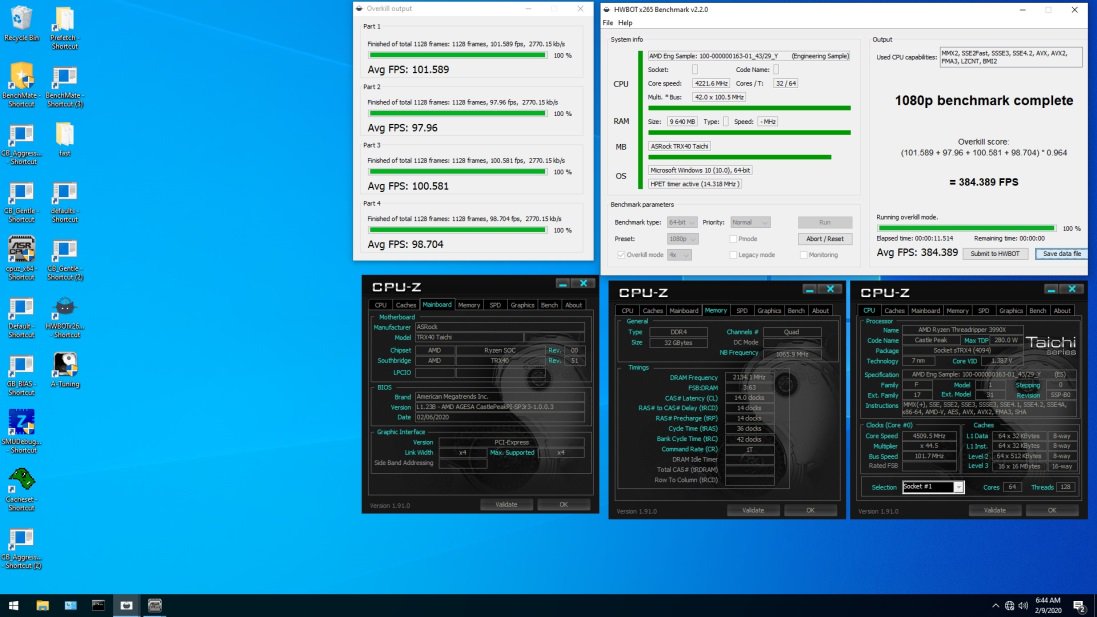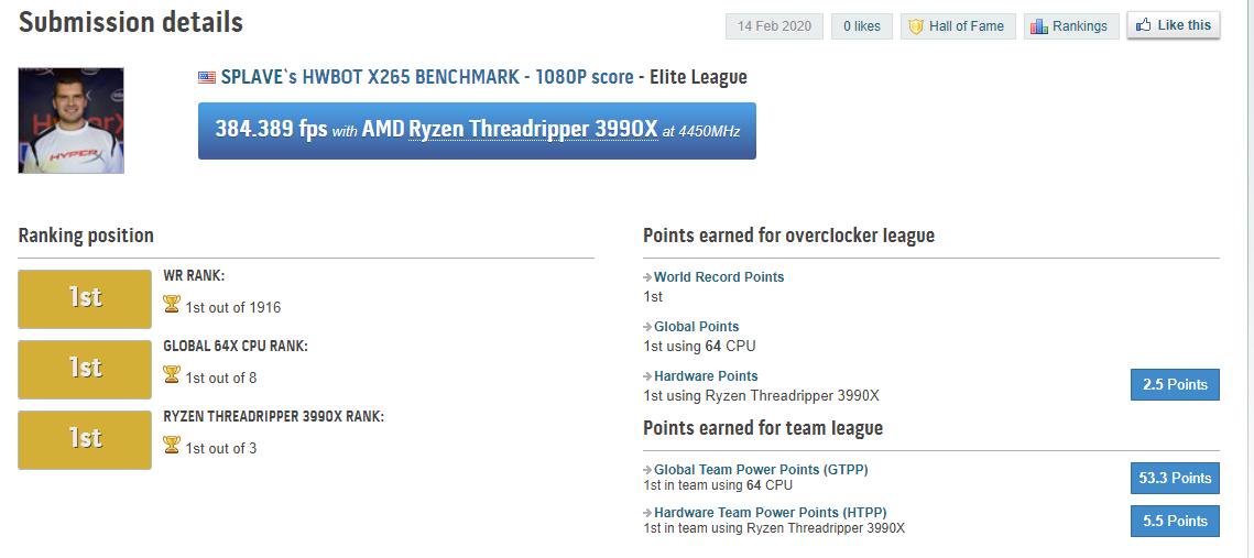 ↑Splave makes incredible success in taking another world first place, receiving 384.389 fps with Ryzen Threadripper 3990X and TRX40 Taichi in HWBOTx265 Benchmark-1080p. (Check submission on HWBOT )