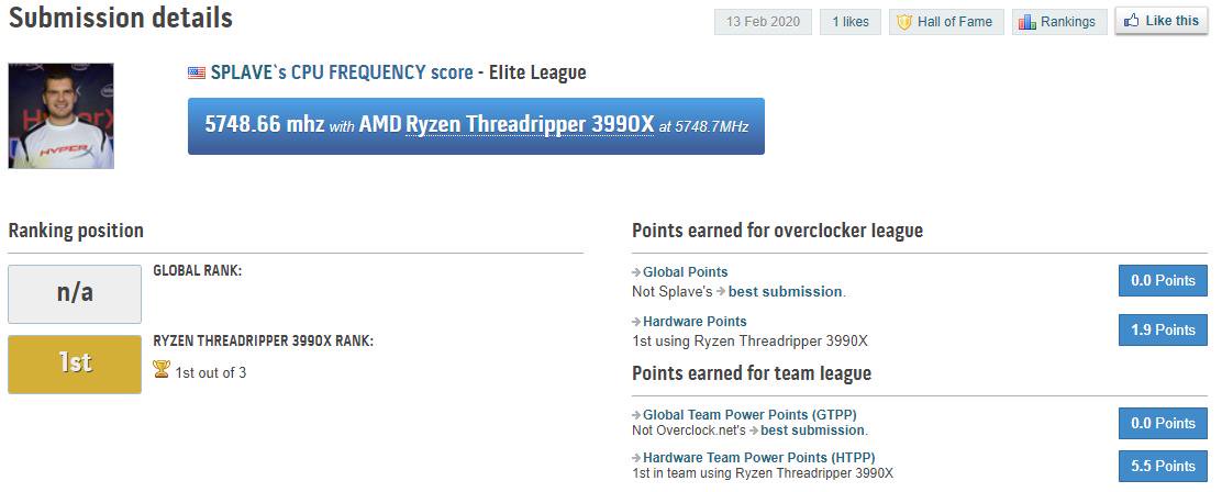 Last but not least, Splave achieves validated frequency of 5748.66MHz on Ryzen Threadripper 3990X. (Check submission on HWBOT )