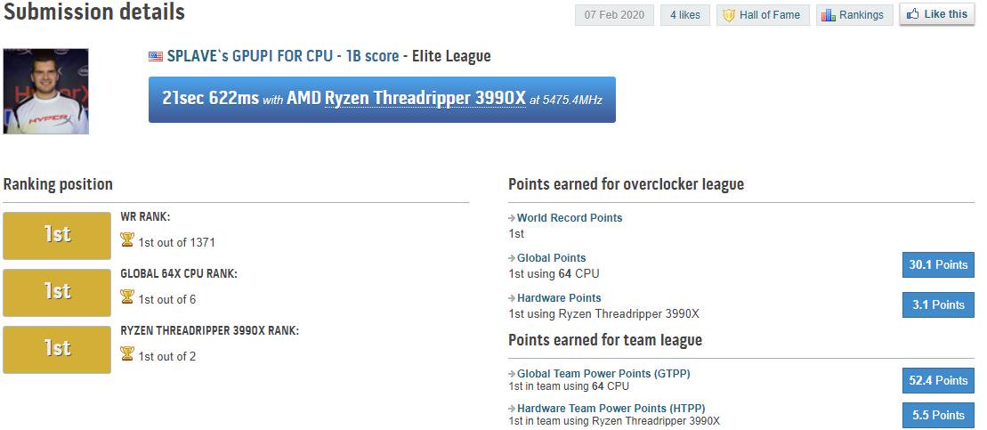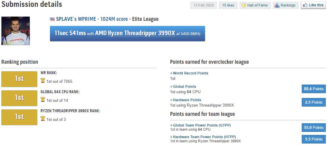 ↑Splave takes a huge lead by getting 11sec 541ms with Ryzen Threadripper 3990X by using the ASRock TRX40 Taichi, and captured the 1st place of World Record. (Check the submission on HWBOT)