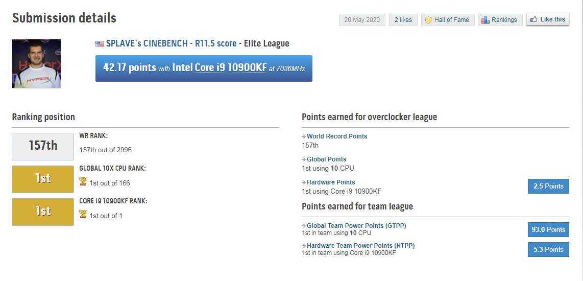 ↑ In conjunction with Intel® Core i9-10900KF with the ASRock Z490 AQUA (special version), Splave creates a new record of 42.17 points on CINEBENCH-R11.5 and wins the Global First Place. (Check submission on HWBOT )