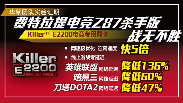 搭载电竞界最高荣誉的 Killer E2200网络芯片, Z87 杀手版致力于提供玩家最杀的电竞技术与优势, 允诺最优质的网速服务。经华擎专业团队实测证明, 内建 Killer 电竞专用网卡的 Z87 杀手版主板, 在 UDP (User Datagram Protocol) 这类需反应灵敏的应用程序上, 可提供高达 5倍的连网速度, 享受更飞速的游戏飨宴!此外, 在分秒必争的在线电竞战斗中, 使用这张王牌主板抗敌, 亦能享有效能提升、低延迟的实质利益;在专业测试中发现, Z87 杀手版在各项热门游戏都有出奇制胜的表现, 在英雄联盟 LOL 降低网络等待时间高达136%、暗黑三 Diablo 3 降低60%、刀塔DOTA2 降低47%, 选择华擎 Z87 杀手版, 玩家更能尽情徜洋在在线游戏乐趣, 无需忧虑网络等待时间影响制胜关键!