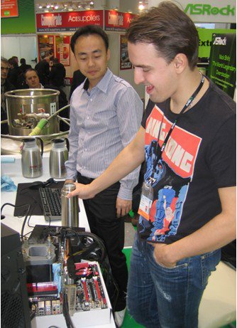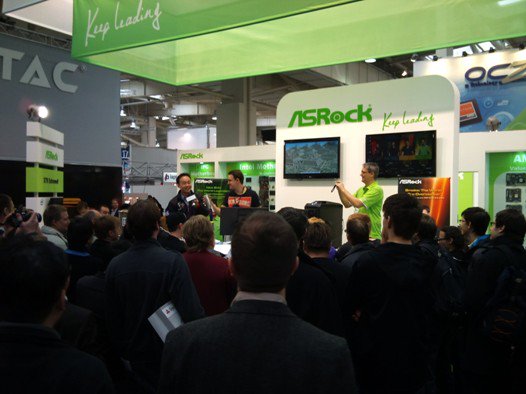 Le public très présent sur le stand ASRock au CeBIT pour assister à la démonstration d'overclocking de Nick Shih et Smoke.