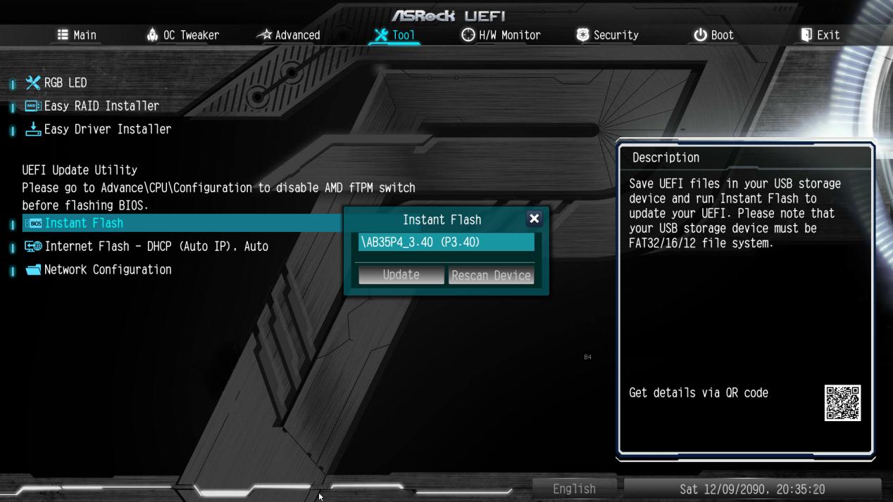 [Tool (ツール) ] メニューでインスタントフラッシュユーティリティを選択し、 RYZEN™ DESKTOP 2000シリーズ対応BIOSを選択して更新します。