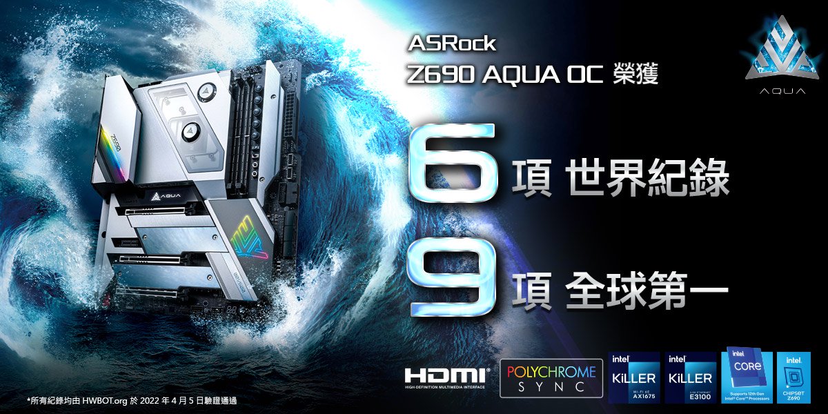 全球主機板、顯示卡與迷你電腦領導廠商華擎科技(ASRock Inc.), 很榮幸的宣布所向披靡的Z690 AQUA OC, 再次打破 HWBOT.org 上的多項超頻紀錄。 全球專業超頻玩家 Splave 使用Z690 AQUA OC 主機板搭配 Intel® Core™ i9-12900KS進行多項超頻測試, 創下 6 項世界紀錄和 9 項全球第一。
