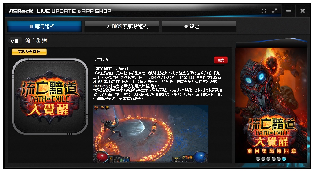 Z170 Gaming系列主機板上市後以超強規格和優異電競效能引起玩家熱烈討論, 華擎特別加碼再放送, 針對三款Z170主流機種Z170 Gaming K4、Z170 Extreme4、H170 Performance主機板贈送熱門遊戲《流亡黯道PoE》遊戲虛寶組合包, 內容包含三種虛寶: 頭部外觀(青焰亡顱)、武器特效(幽冷青焰)和行走特效(青焰鬼步), 市價超過新台幣1170元! 只要透過華擎指定型號主機板內建軟體ASRock APP Shop下載《流亡黯道PoE》即可領取, 可說是現買現賺!