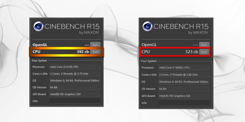 ↑ASRock DeskMini hitting 392 cb CPU score on Cinebench R15 with an Intel® Core i3-6100 processor, while other systems don't even come close with a Core i7-6500U processor.