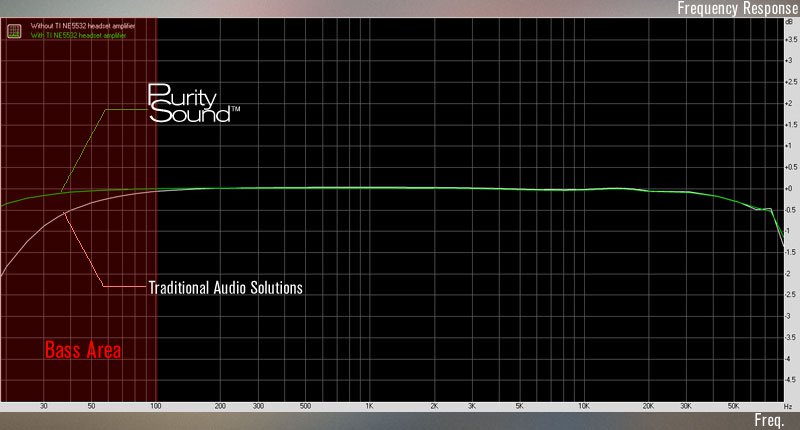 | This graph indicates how traditional audio solution’s signal-to-noise ratio drops drastically at low frequencies, while Purity Sound™ maintains its signal-to noise ratio and provides better bass with the TI NE5532 amplifier. |