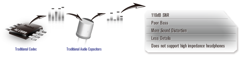 | Unlike traditional onboard audio solutions that use single sided output and capacitors, Purity Sound uses a differential codec for differential output, and the signals go through a differential amplifier TI NE5532 with Direct Drive technology, thus providing Purity Sound! |