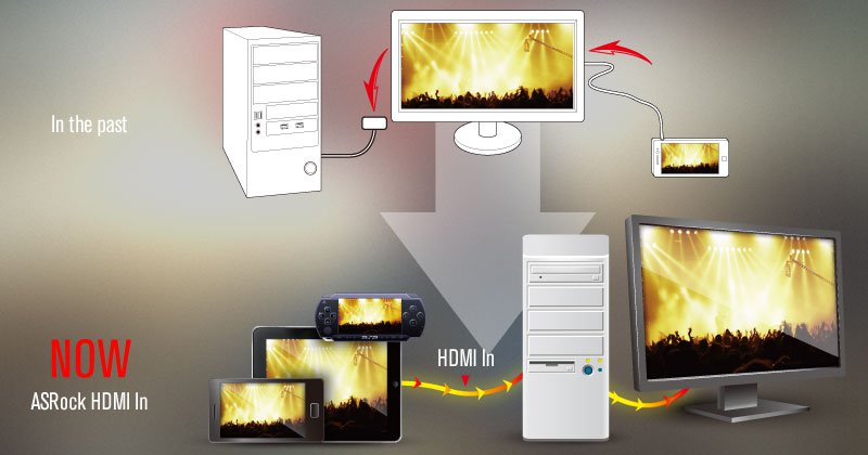 Tired of constantly switching devices to connect to your one and only monitor? From now on just connect the monitor to your motherboard, and connect your secondary device to the motherboard's HDMI-In port. With HDMI-In users may conveniently toggle between the computer's screen and the secondary device's screen with a hotkey, or even use their secondary device without powering on the computer. |