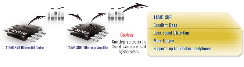 | Unlike traditional onboard audio solutions that use single sided output and capacitors, Purity Sound uses a differential codec for differential output, and the signals go through a differential amplifier TI NE5532 with Direct Drive technology, thus providing Purity Sound! |