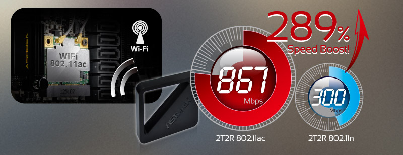802.11ac WiFi is a new wireless computer networking standard that provides high-throughput wireless local area networks on the 5GHz band with data transferring speeds up to 867Mbps. Get a kick out of the fastest connections with ASRock's 2T2R Dual Band 802.11ac WiFi and Bluetooth v4.0! |
