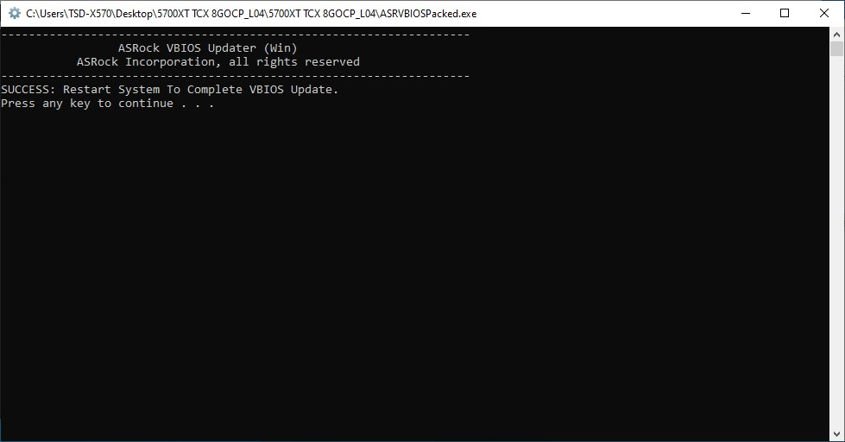 After vBIOS update is finished, it will show "SUCCESS: Restart System To Complete VBIOS Update". Please press any key and reboot your system to finish the BIOS update procedures.